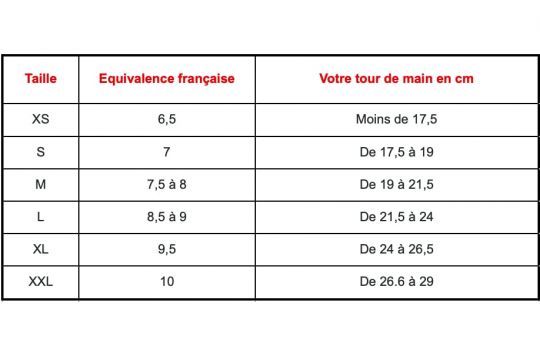 - Référez-vous au tableau des tailles : Consultez le tableau des tailles fourni par le fabricant ou le vendeur de gants. Reportez la mesure obtenue sur le tableau pour déterminer votre taille de gants.